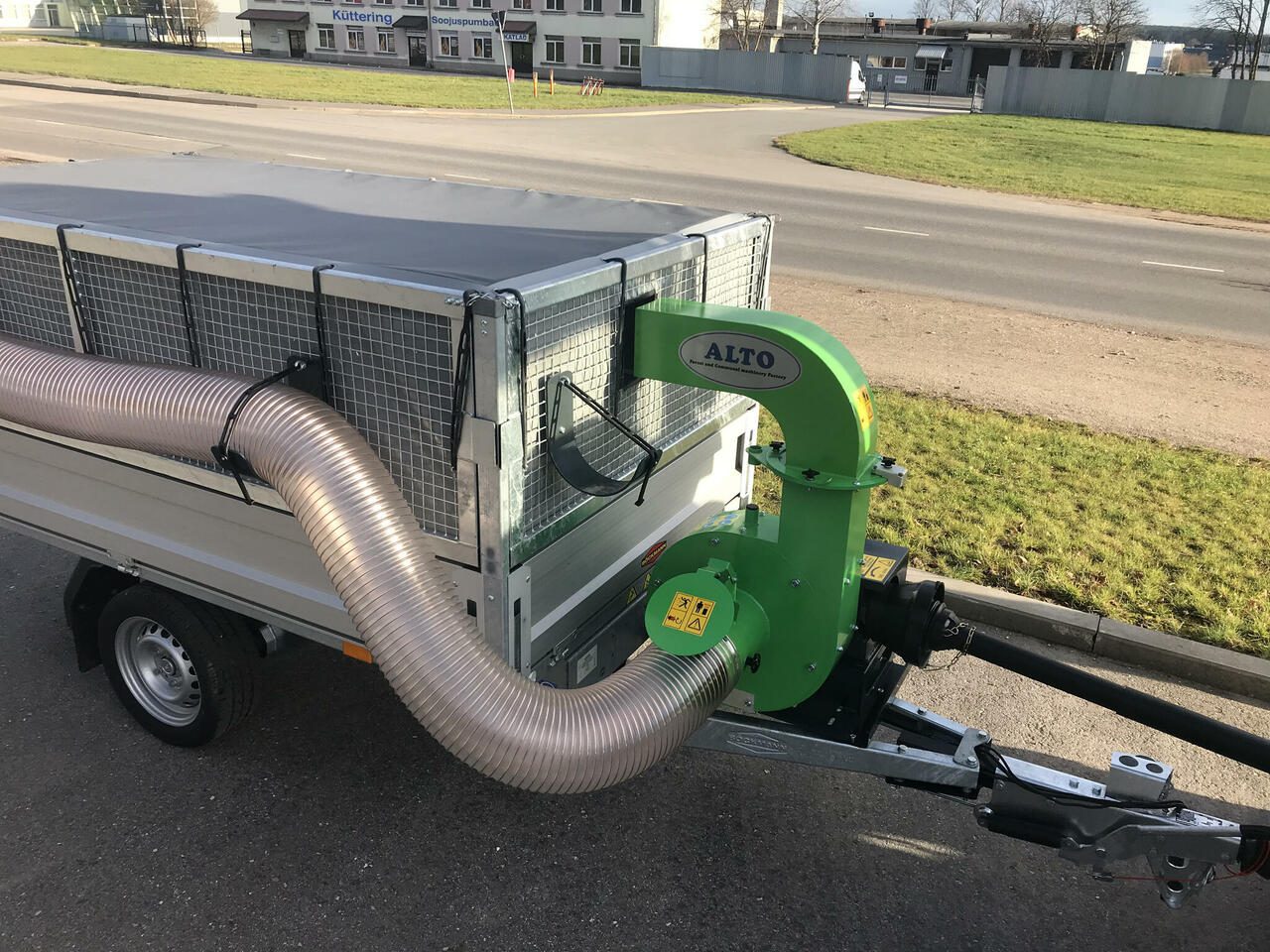Sauger/Häcksler für die Kommunalverwaltung zur Müllbeseitigung auf Straßen, Plätzen und in Parks sowie zum Sammeln von losem Gras, Laub, feinen Zweigen, Zapfen, Eicheln, Plastikverpackungen und -flaschen usw. in einem Anhänger. Der Sauger kann einfach an das Traktorenmähdeck, die Saugöffnung/Bürste oder das Handstück angeschlossen werden. Wenn Sie Laub von einer Schwade oder einem Haufen aufsaugen möchten, können Sie das erforderliche Handstück am Ende des Saugrohrs befestigen. Am Handstück sind zwei Räder befestigt, was die Handhabung erleichtert.